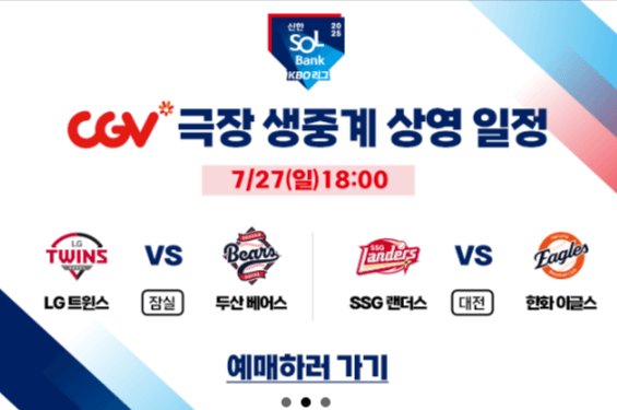 | 7/27(일) 18:00 | LG vs 두산 / SSG vs 한화 | CGV 극장 | 극장 생중계 |