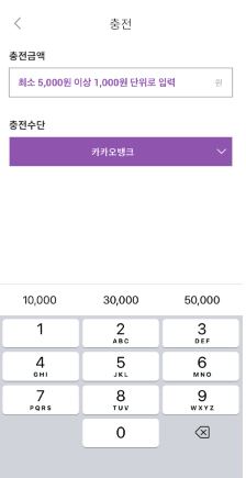- 5,000원부터 1,000원 단위 충전