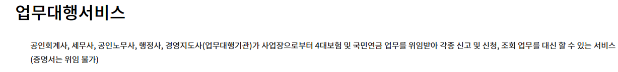 - 업무대행 시 업무대행기관 등록 및 승인 필요 (세무사, 회계사, 노무사 등)